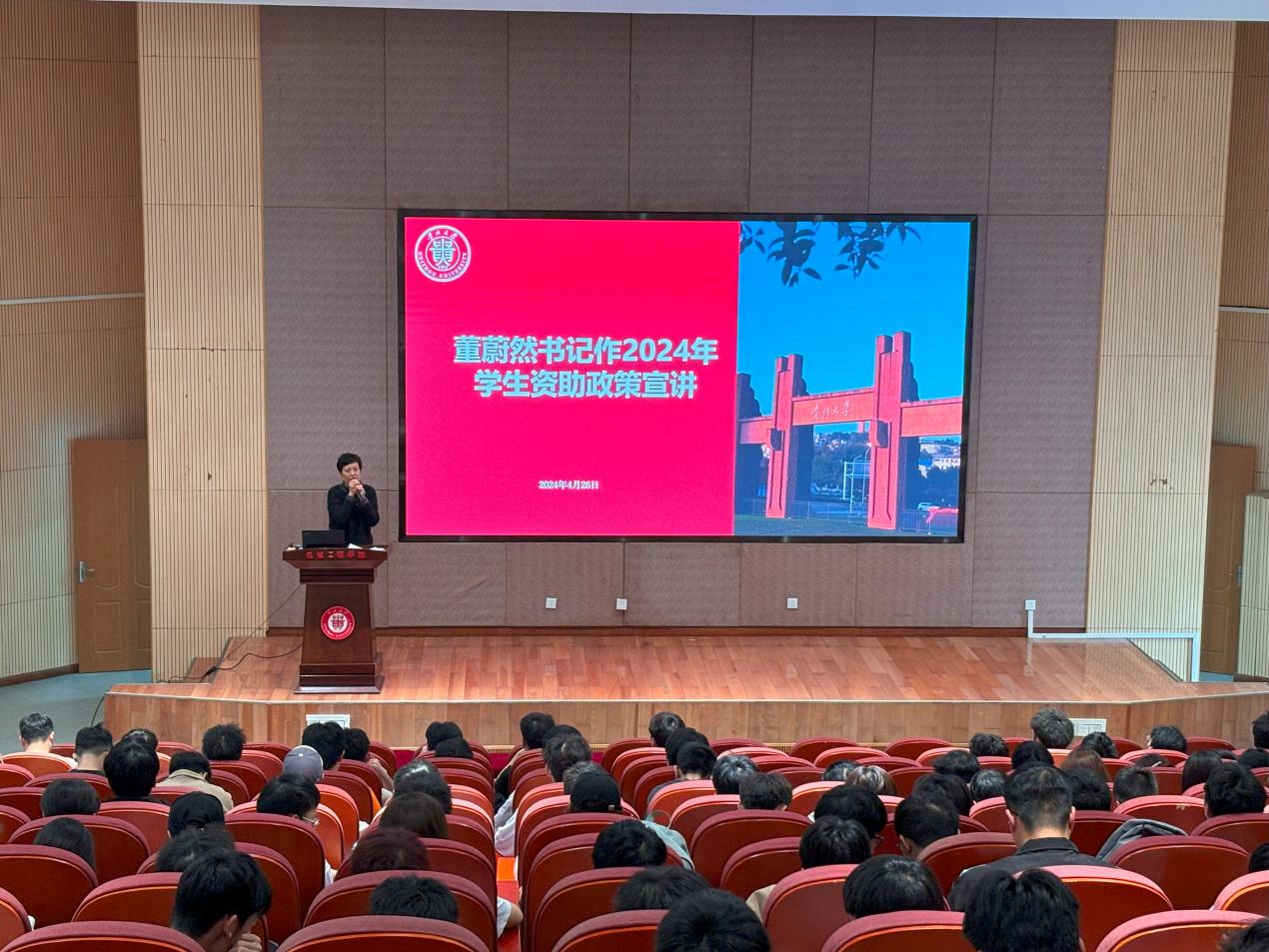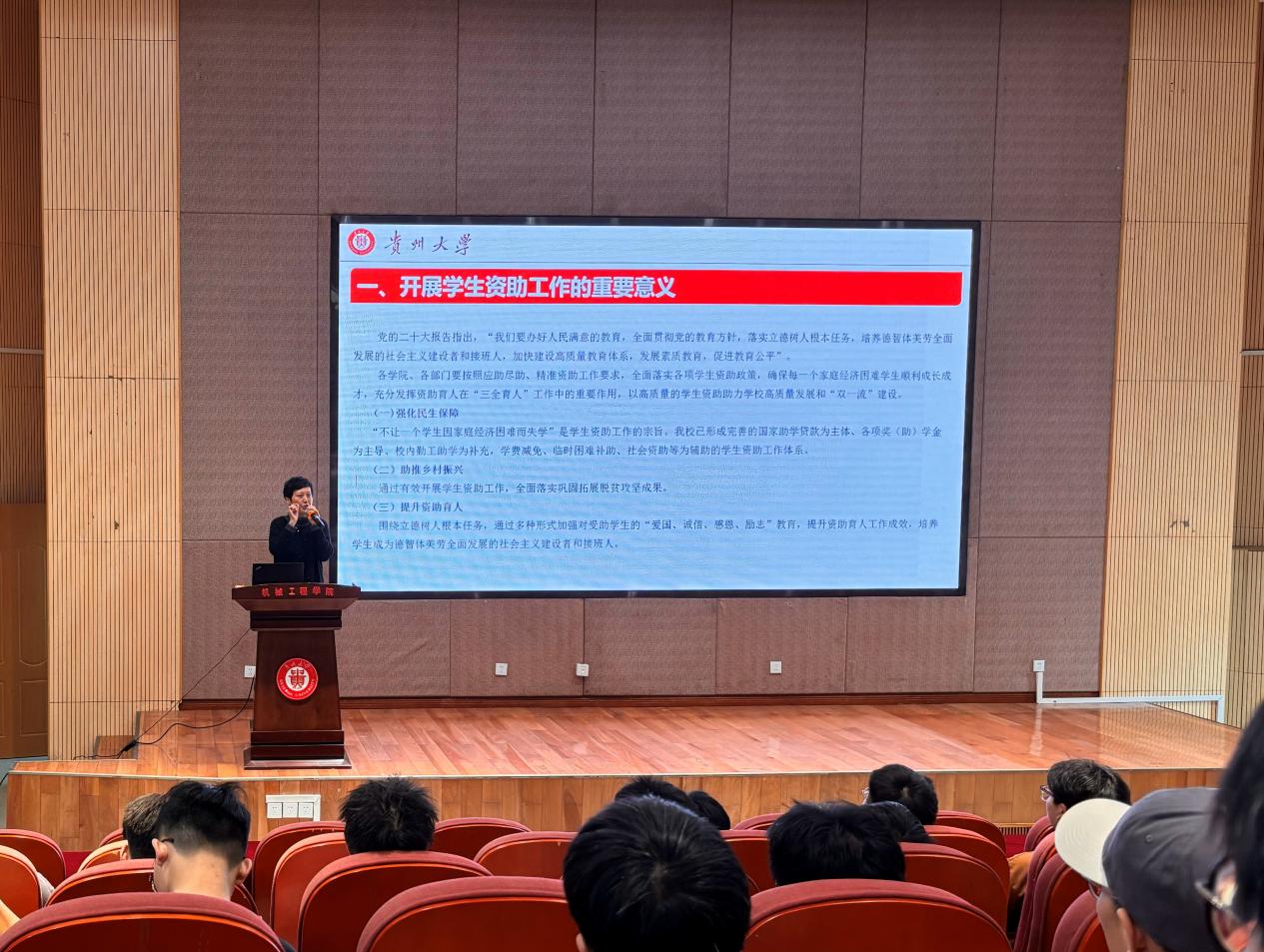 活動伊始,董蔚然同志發(fā)表了熱情洋溢的致辭,從開展學(xué)生資助工作的重要意義、目前高校學(xué)生資助政策、貴州大學(xué)學(xué)生資助體系及學(xué)生受助情況、開展學(xué)生資助工作、如何凸顯資助育人成效5個方面向同學(xué)們進(jìn)行宣講。她強(qiáng)調(diào)了資助政策對于促進(jìn)教育公平、助力學(xué)生成長的重要意義,并鼓勵學(xué)生們積極了解政策、申請資助,為自己的未來發(fā)展打下堅(jiān)實(shí)的基礎(chǔ)。