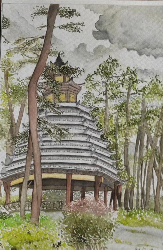 這幅作品取地貴州大學育賢廣場寫生,畫面中心是位于廣場中心的侗寨鼓樓。其獨特風格體現(xiàn)了中國傳統(tǒng)建筑的魅力。周圍環(huán)繞著郁郁蔥蔥的綠色植被和樹木,為整個場景增添了生機與活力。天空中密布的云為畫面增添了一種神秘而寧靜的氛圍,與地面的建筑和植被形成鮮明對比,進一步凸顯了自然與人文的和諧共存。整個畫面色彩柔和,構(gòu)圖和諧,展現(xiàn)了一種平和與自然之美的感覺。