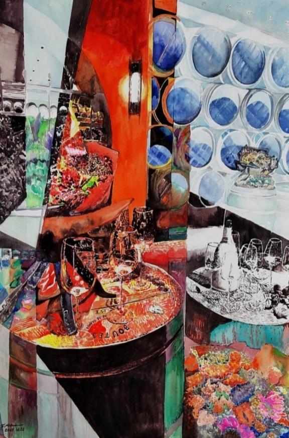 描繪的是師生聚會的場景,黑白的色彩代表過去,鮮艷的色彩代表今天仍然記憶猶新。