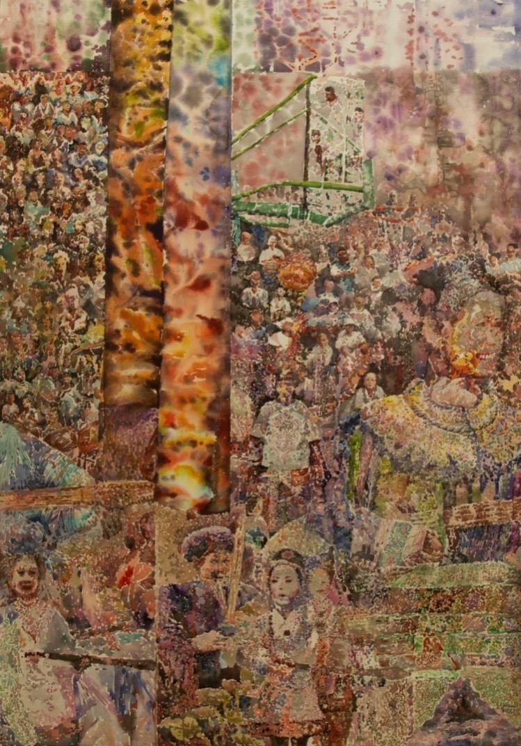 2022年,貴州省黔東南州臺盤鄉(xiāng)臺盤村舉辦貴州省“美麗鄉(xiāng)村”籃球聯(lián)賽?;鸨W(wǎng),被稱之為“村BA”?!按?/span>BA”由“六月六”吃新節(jié)籃球賽演變而來,已有百年歷史。畫面上方描繪了密密麻麻的觀眾,左中下方為幾個表演反排木鼓舞的村民,中間為一個籃球架和打籃球的選手,右方是一個微笑著表演侗家琵琶音的姑娘。畫面用斑斕的色彩表現(xiàn)了多彩貴州豐富燦爛的民族文化,也表達了作者希望傳統(tǒng)民族文化在新時代煥發(fā)出新的生機活力,綻放出更加迷人的光彩的愿望。