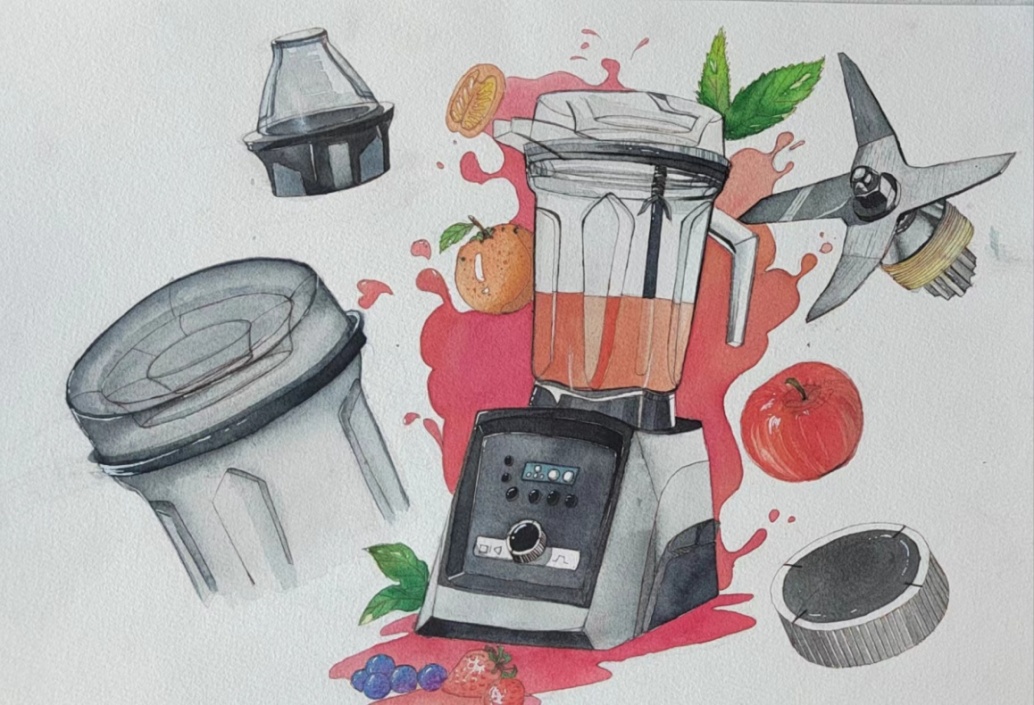 這張圖片展示了一臺水彩畫風格的榨汁機。主體色調(diào)通透,給人一種清新自然而又現(xiàn)代的感覺。內(nèi)部放著顏色鮮艷的小番茄,增添了畫面的色彩對比,使畫面充滿生機和活力。