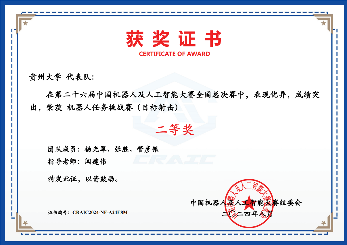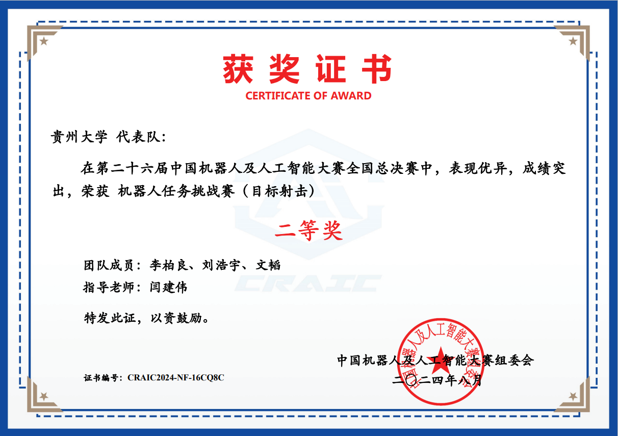 2 | 機(jī)器人任務(wù)挑戰(zhàn)賽(目標(biāo)射擊) | CRAIC20241AYRR5JB | 張少俠、蒙超、王占坤 | 全國一等獎(jiǎng) |