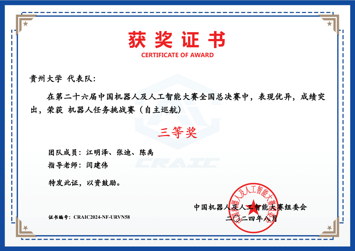 6 | 機(jī)器人任務(wù)挑戰(zhàn)賽(自主巡航) | CRAIC2024PMI5BXKX | 江明澤、張迪、陳禹 | 全國三等獎(jiǎng) |