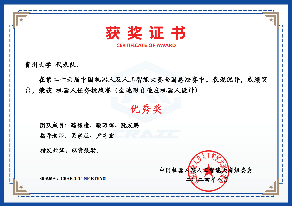 7 | 機(jī)器人任務(wù)挑戰(zhàn)賽(全地形自適應(yīng)機(jī)器人設(shè)計(jì)) | CRAIC20249Y4HPBFI | 趙梓衡、滕勇軍、米小紅 | 全國三等獎(jiǎng) |