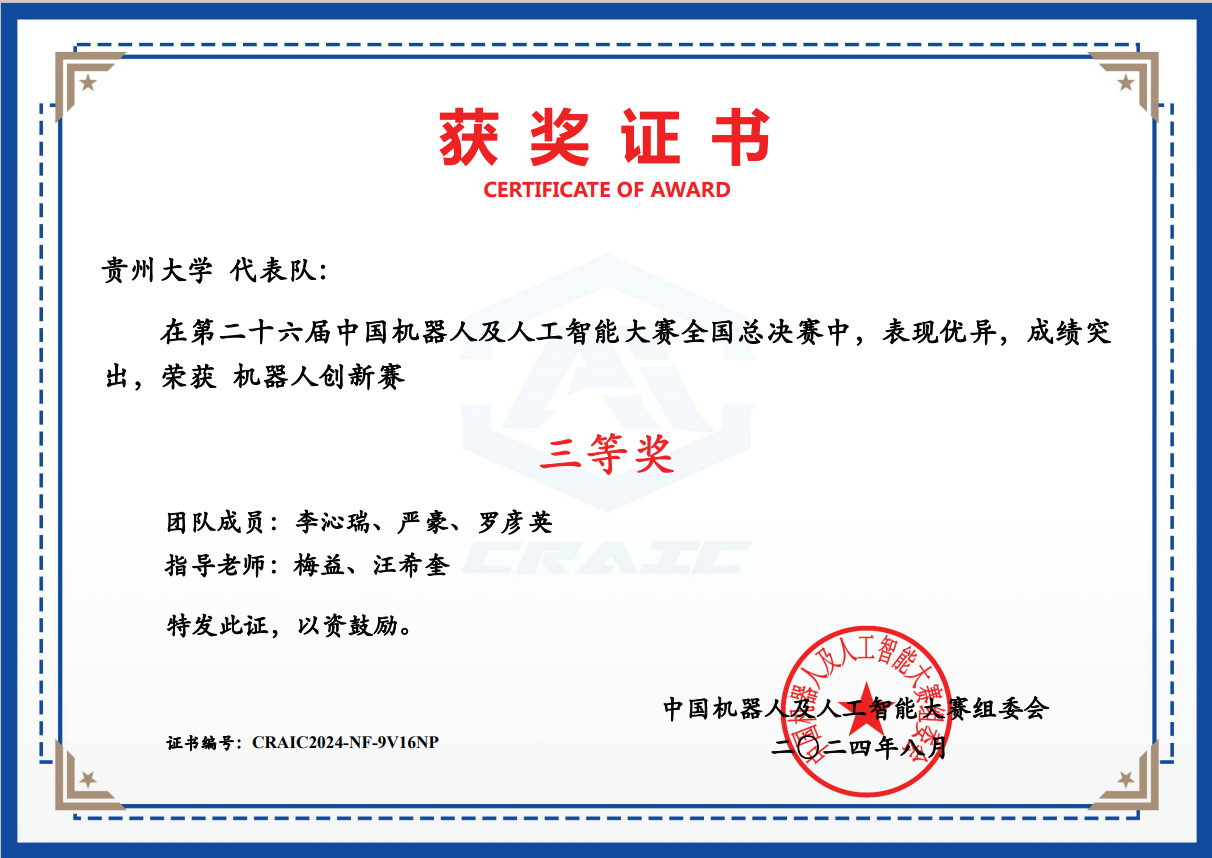 8 | 機(jī)器人創(chuàng)新賽 | CRAIC2024TVCKGBPC | 李沁瑞、嚴(yán)豪、羅彥英 | 全國三等獎(jiǎng) |