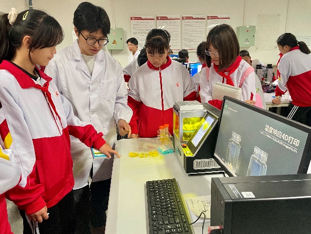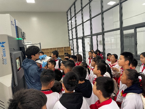在智能制造實驗室,學生們觀看了機器人自動焊接的演示,了解了機器人在工業(yè)制造中的廣泛應用和自動化工作流程。隨后,學生們來到智能網(wǎng)聯(lián)汽車展區(qū)體驗無人駕駛技術,通過講解員的介紹初步了解了汽車互聯(lián)技術在未來生活中的重要作用。農機實驗室的展示進一步擴展了學生的視野,展示了貴州特有的“山地拓荒者”、“智能種植家”等農機設備,生動展示了現(xiàn)代農業(yè)機械在不同地形中的應用場景,讓學生們體會到科技對農業(yè)的巨大推動作用。在金屬增材制造實驗室,學生們目睹了金屬3D打印過程,了解到3D打印技術在制造業(yè)的變革性意義。最后,在生物制造實驗室,同學們觀看了生物3D打印的演示,從醫(yī)工交叉應用角度,了解3D打印在生物組織和醫(yī)學工程中的廣泛應用。